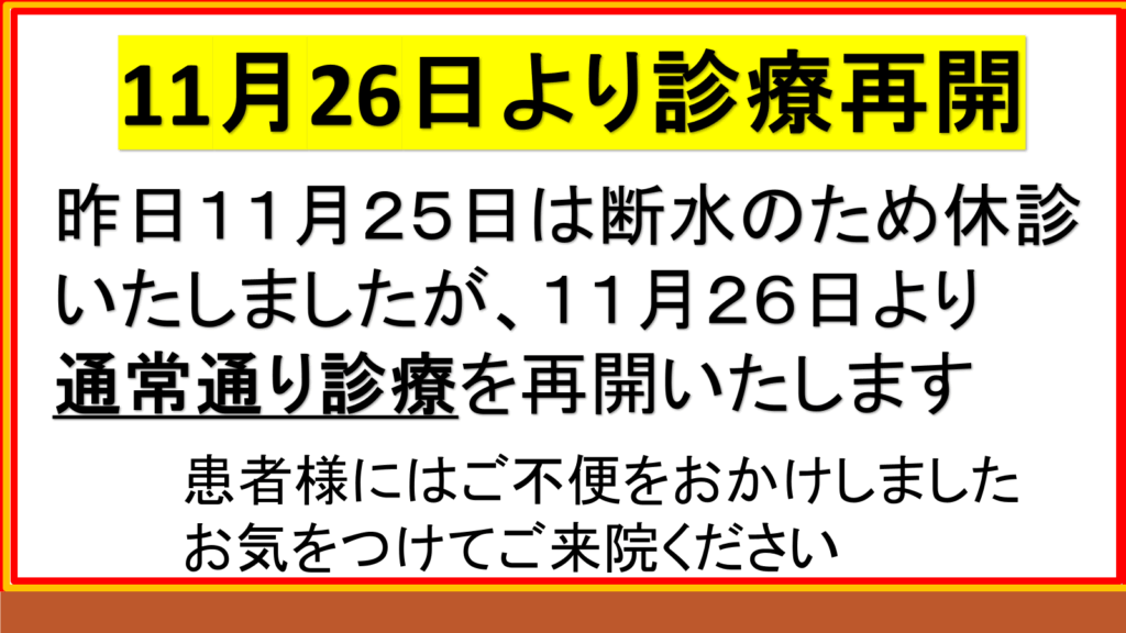昨日(11月25日)は断水の影響で臨時休診となり、患者様にはご不便、ご迷惑をおかけしました。