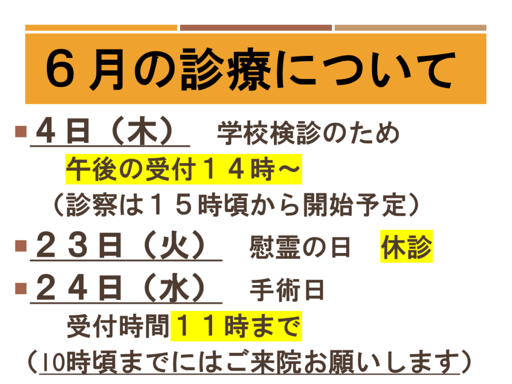 ①6月4日(木)は学校検診のため、午後の受付を14時からとさせていただきます。